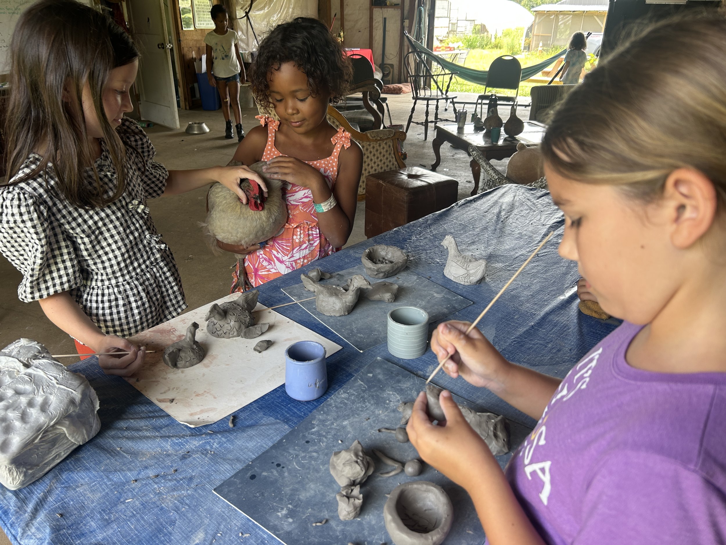 In the afternoon, campers explore the stream and farm with caring, safety conscious adults. This camp will be held on a working ranch where artists can interact with horses under adult supervision, play in the stream, create art (including some pottery projects), cook, craft, sing and more!